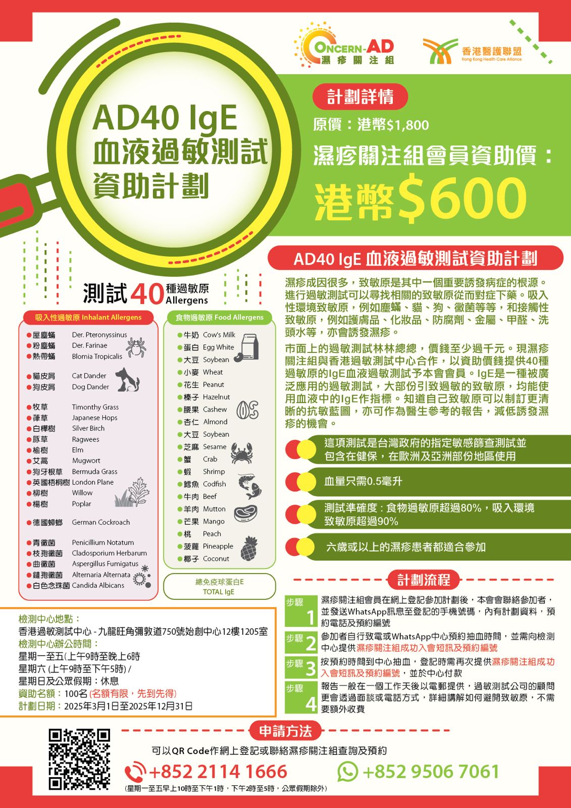 市面過敏測試林林總總,價錢至少過千元。現濕疹關注組與香港過敏測試中心合作,以資助價錢提供40種過敏原的IgE血液過敏測試予本會會員。IgE 是一種被廣泛應用的過敏測試,大部份引致過敏的致敏原,均能使用血液中的IgE作指標。知道自己致敏原可以制訂更清晰的抗病藍圖,如何避開食物及吸入性環境致敏原,亦可作為醫生參考的報告,減低誘發濕疹的機會。
