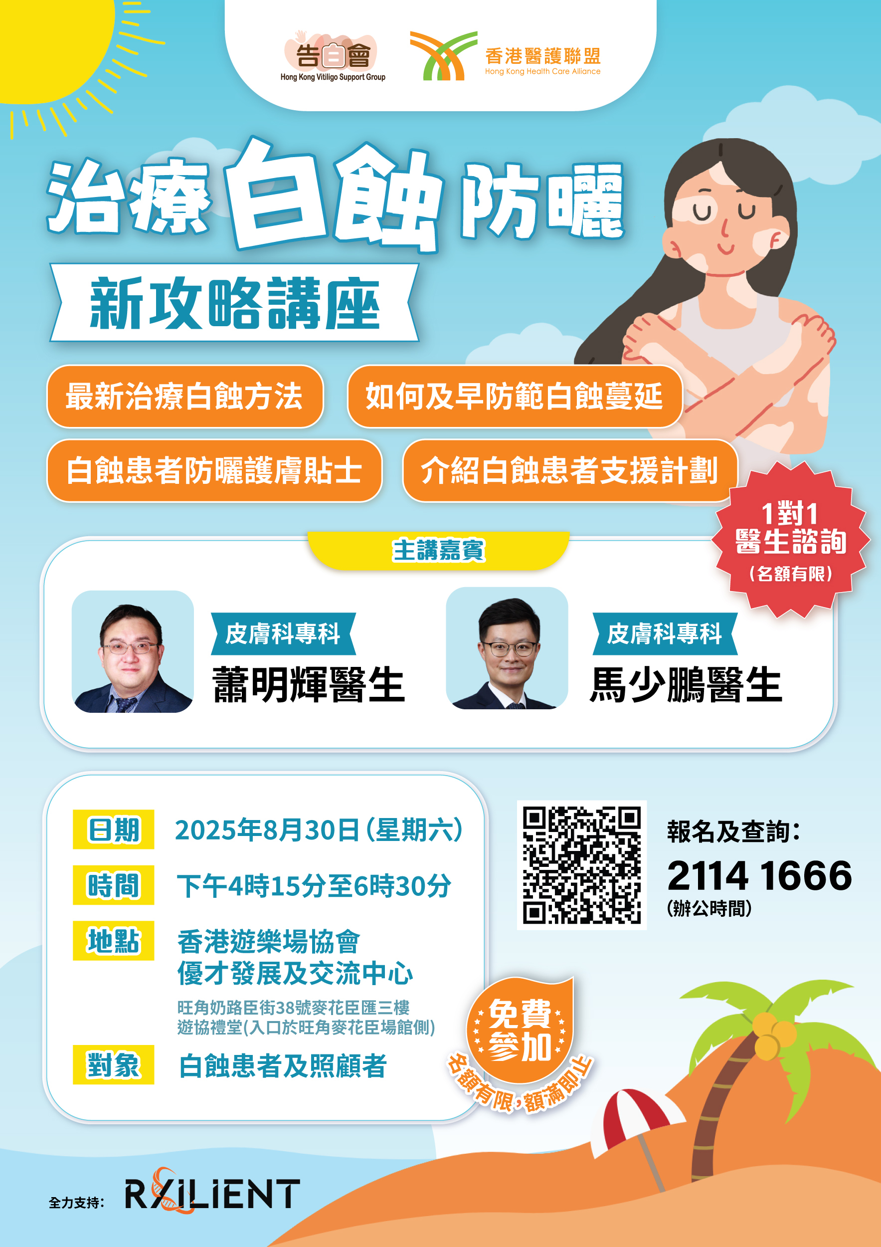 治療白蝕,首要做好防曬,因為皮損缺乏正常色素,皮膚容易灼傷,亦令白蝕皮膚與正常皮膚有更大差異,影響患者的心理。是次講座由兩位皮膚科醫生主講,分享防曬措施及適合白蝕患者的護膚建議,幫助患者更好地保護皮膚,提升生活質量。 對象:白蝕患者及照顧者