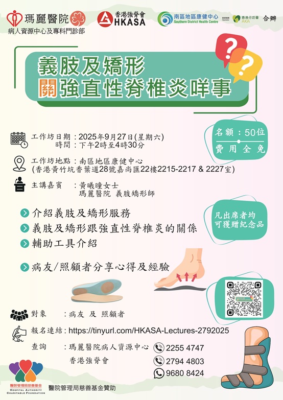 備註: (1) 有興趣人士必須於網上報名参加活動。資料經審核後,香港強脊會將向成功報名之參加者發出確認通知。 (2) 請注意,不獲確認之人士將不能進入會場及参與活動。 (3) 香港強脊會保留活動安排之最終決定權。 如有查詢,請聯絡:『香港強脊會』- (852) 2794 4803 『香港強脊會』 Facebook: www.facebook.com/hkasa.page|網站: www.hkasa.hk