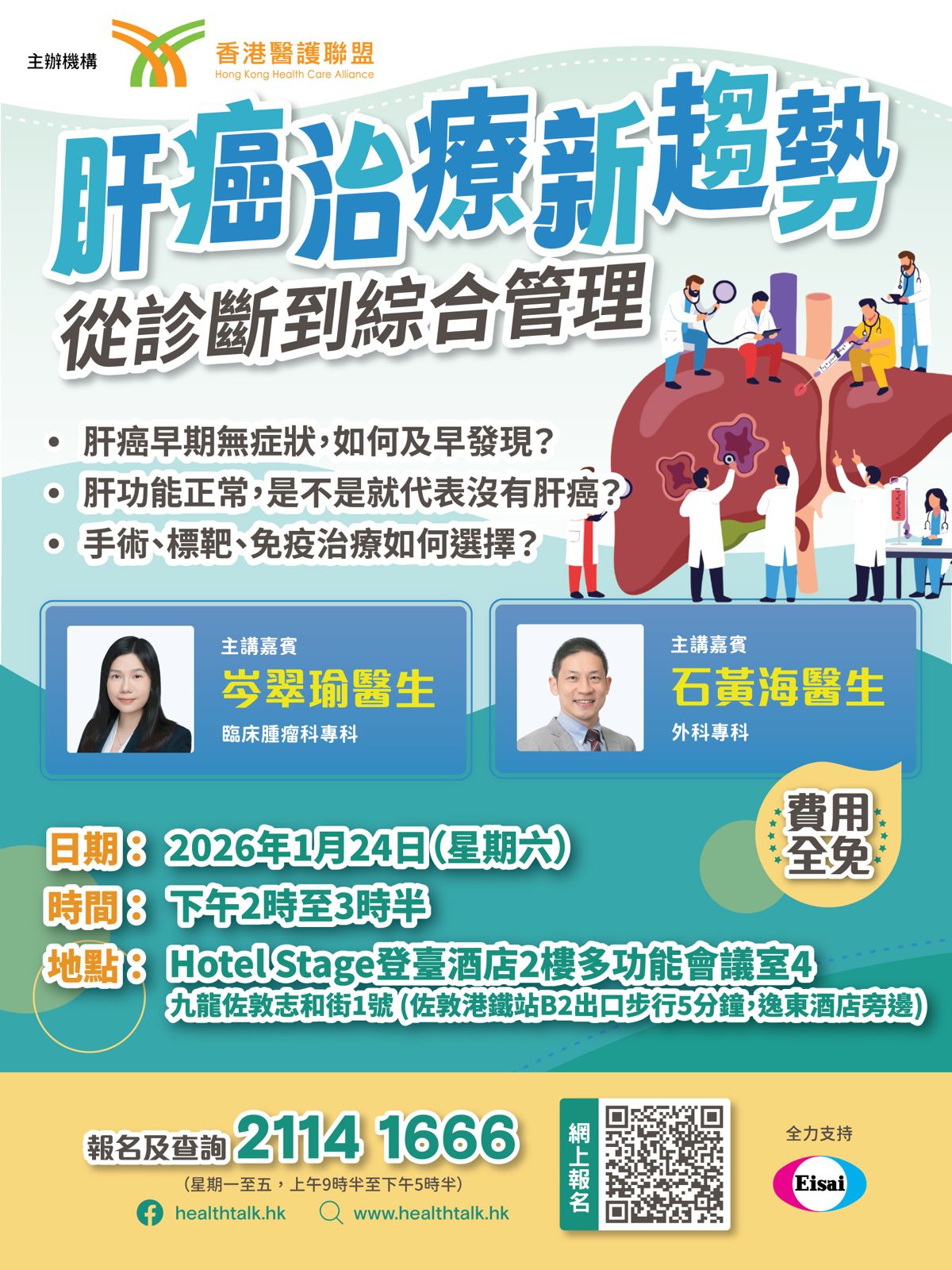 肝癌早期往往沒有明顯症狀,容易被忽略。是次講座將由專科醫生深入說明如何及早發現肝癌、釐清肝功能正常是否就代表沒有肝癌風險、並解析手術、標靶治療與免疫治療等不同治療選擇與最新趨勢,協助大家全面了解肝癌的診斷與整合管理,為健康把關 !