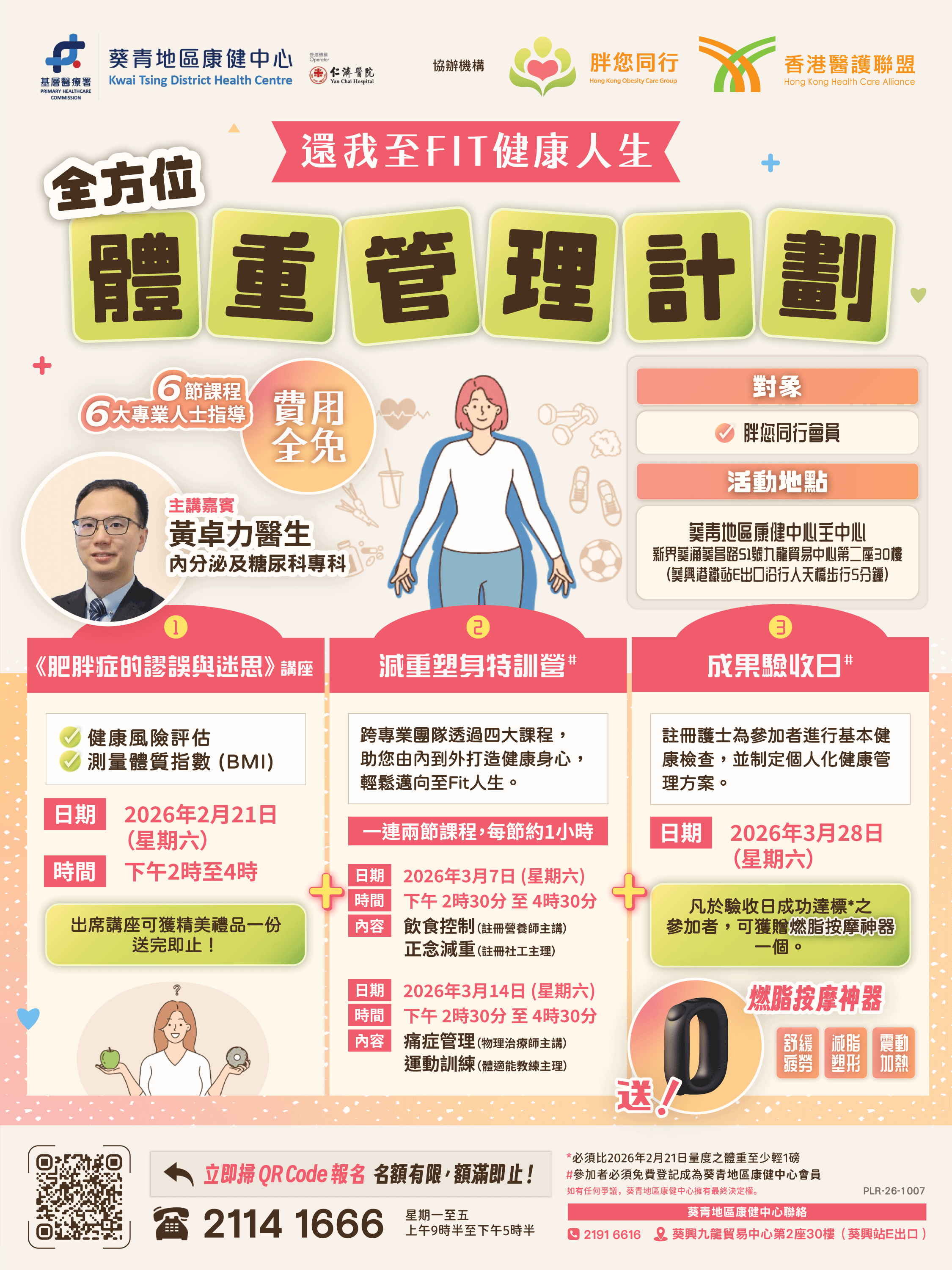 想輕鬆又有系統地瘦身、改善健康?由葵青地區康健中心、香港醫護聯盟及胖您同行聯合主辦,並由六大專業人士組成的跨專業團隊,精心設計四大核心課程、六節實用課堂,陪你一步步由內到外打造健康身心!活動橫跨 2026年2月21日至3月28日(逢星期六),內容包括醫生健康講座、註冊營養師飲食控制、正念減重、痛症管理及運動訓練,並於成果驗收日由註冊護士進行基本健康檢查及制定個人化健康管理方案。只要於驗收日成功達標(體重較2026年2月21日量度結果減至少1磅),即可獲贈燃脂按摩神器一個!齊齊學、齊齊做、齊齊瘦,輕鬆邁向更健康、更至Fit的自己!