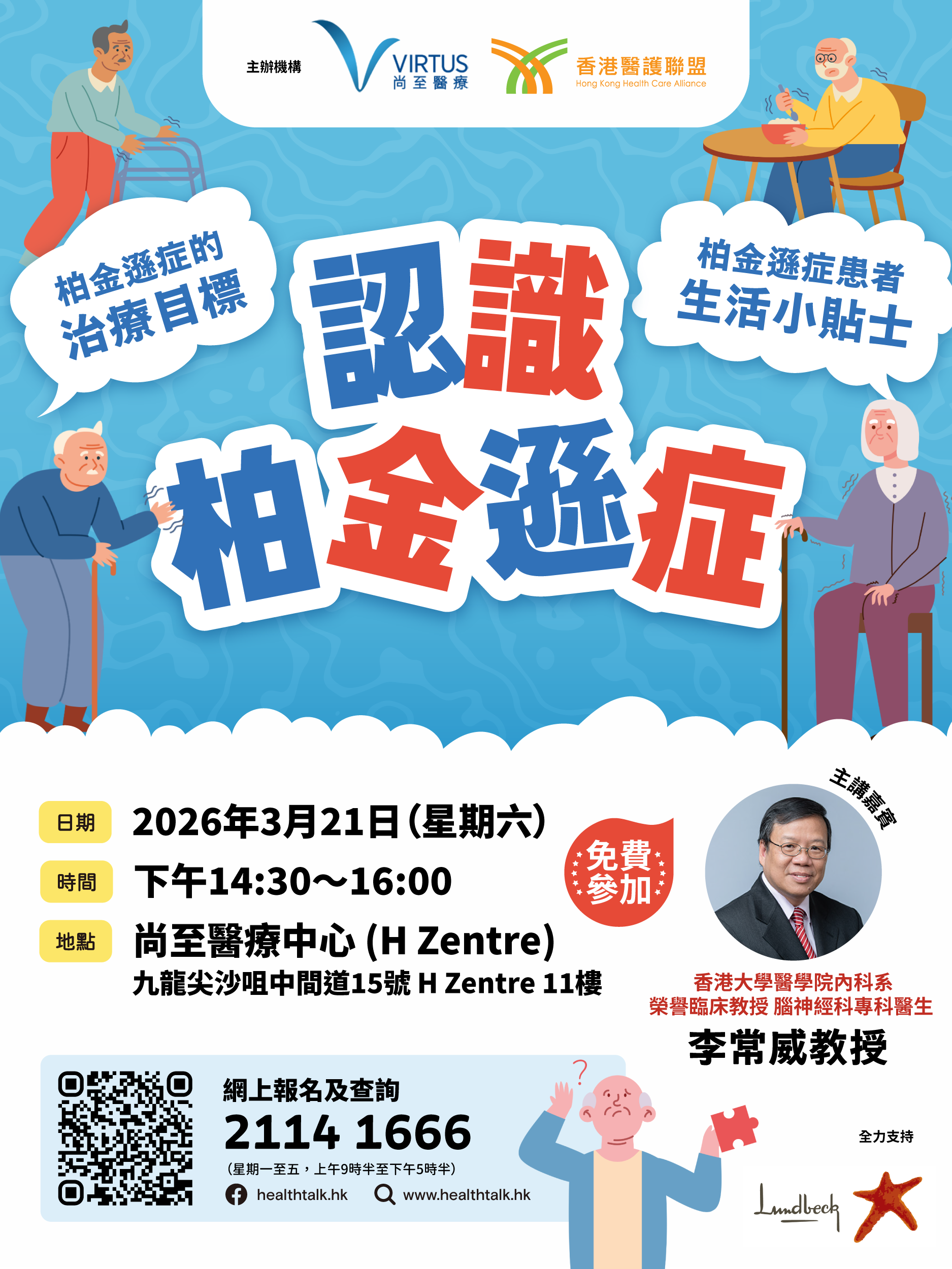 柏金遜症是一種常見的神經退化性疾病,早期症狀未必明顯,容易被忽略,但隨著病情發展,卻可能對日常生活帶來深遠影響 。本講座將由腦神經科專科醫生深入淺出講解柏金遜症的成因與症狀,說明現時的治療目標 ,以及患者在日常生活中可實踐的實用小貼士,協助患者及照顧者更從容面對疾病,提升生活質素 。