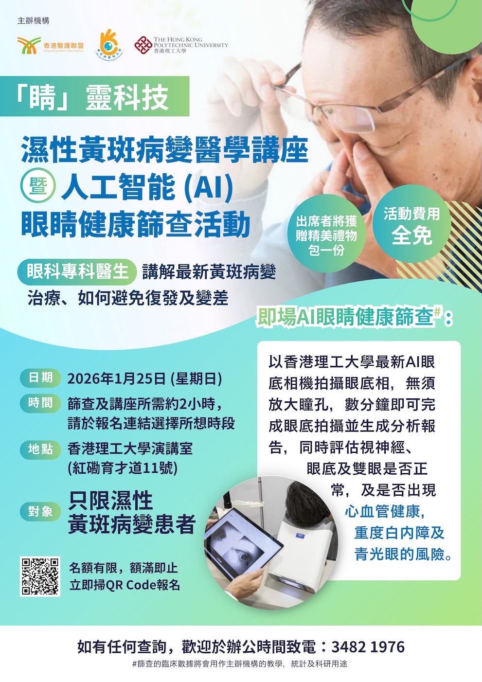 謝謝您報名參加於 2026年1月25日 舉辦的 「睛」靈科技 - 濕性黃斑病變醫學講座 暨 人工智能(AI) 眼睛健康篩查活動 ,我們已經確認您的報名。